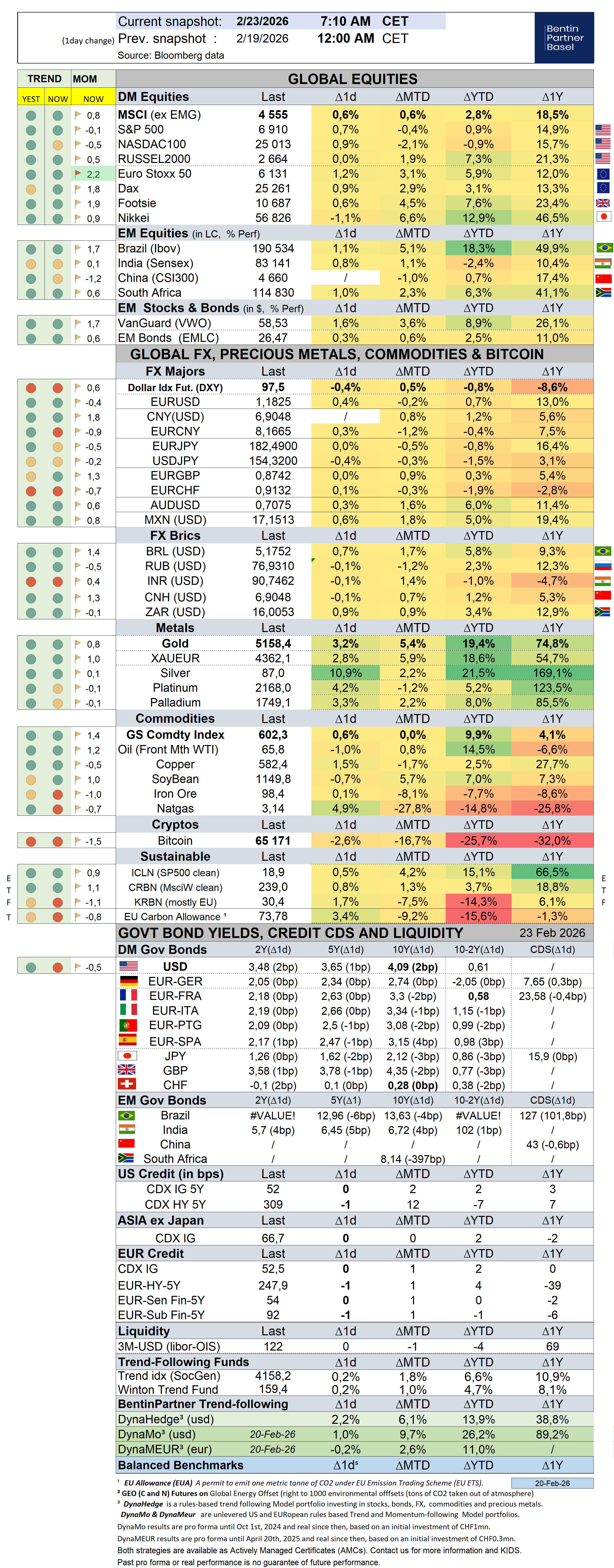 At the same time, private credit woes resurfaced with acuity last week after Blue Owl said it will permanently restrict investors from withdrawing their cash from its private retail debt fund, backtracking from an earlier plan to reopen to redemptions this quarter, saying it was instead liquidating USD1.4bn in assets to raise money to pay out individuals wanting to get out. Stocks across the private-fund industry slid as the deal raised questions about how much fund managers can count on individuals to stay invested in hard-to-sell assets for the long term with Blue Owl's stock shedding 10% at one point last Thursday and closing down nearly -12% on the week while shares of other private-credit providers also sank, including Apollo and Blackstone which dropped -4.1% and -6% last week. Developments at Blue Owl raised some liquidity concerns, accelerating the shift from risk appetite to risk aversion. “Is this a ‘canary-in-the-coal mine’ moment, similar to August 2007? Economist Mohamed El-Erian asked, saying “…the changes echo the early days of the 2008 financial crisis, although nowhere near the same magnitude”.