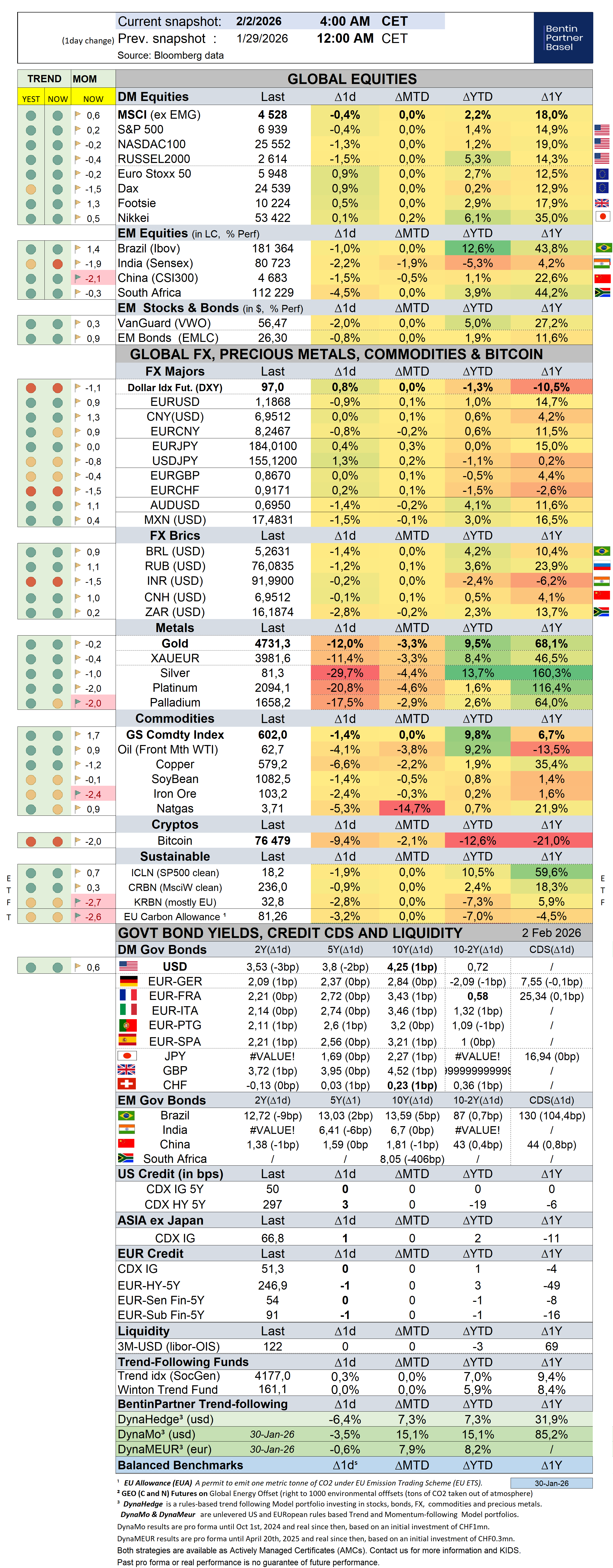 Global markets were shaken, seemingly by the choice of K. Warsh as the new Fed Chair to succeed J. Powell seen as more “hawkish” than the other candidates. While K. Warsh has been more critical of QE, having notably pushed back in 2010 against Bernanke’s move to restart QE, he is by no means a dove…It would appear that he fitted the bill to fuel a narrative seeking to justify a deleveraging that was brought to extremes in several markets sector (including precious metals) and looking for an excuse to start to unwind. S: Druckenmiller who worked with K. Warsh, said no less overnight arguing that seeing K. Warsh as someone who is always hawkish is simply wrong. It would not be a stretch of the imagination to believe that he managed to convince D. Trump to choose him for the top Fed job by being more dovish than others and even supportive of QE if/when the time comes.